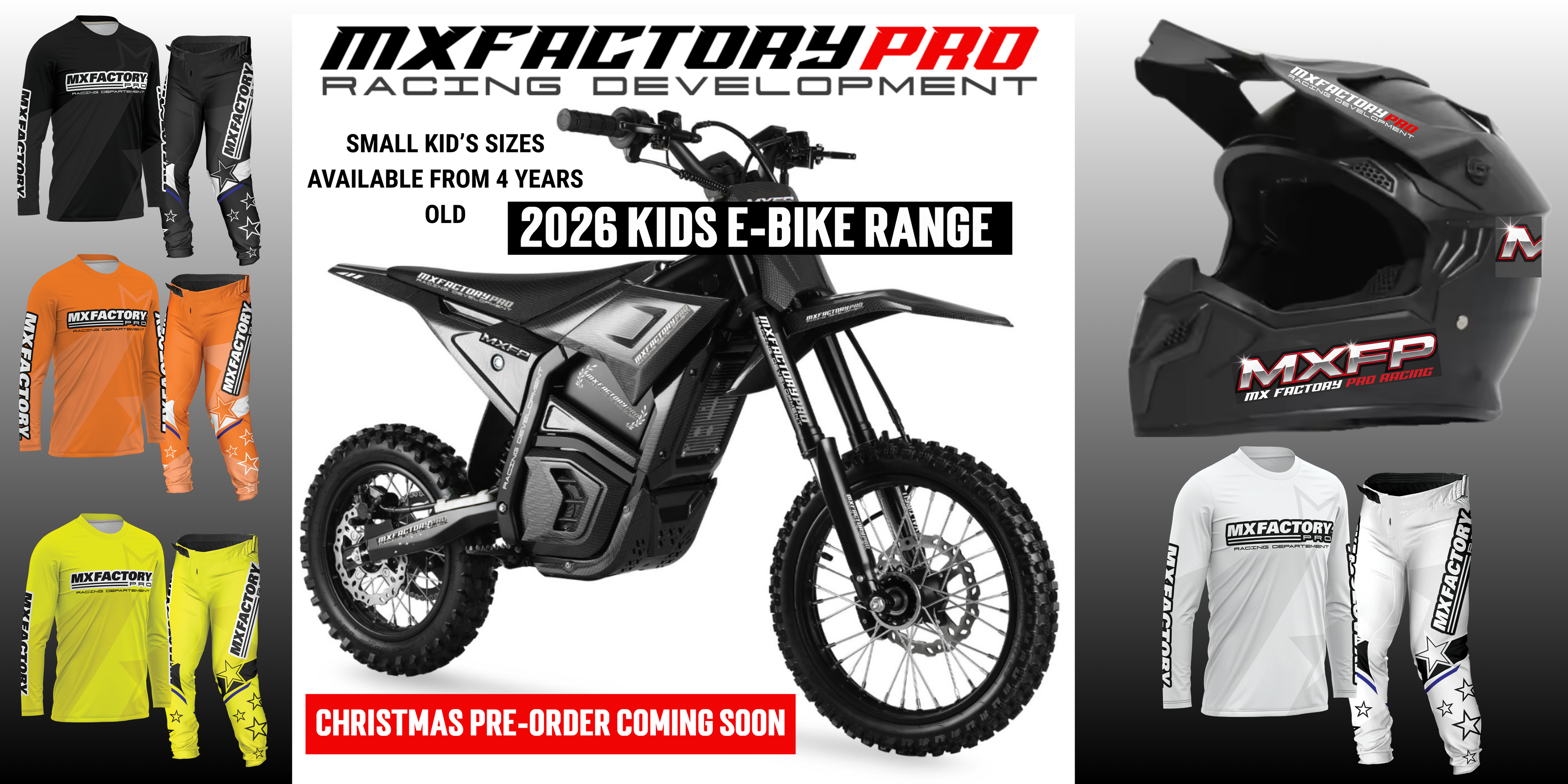 Pre-order 2026 Kids Factory Edition E-Bike & Motocross Racing Gear for Christmas delivery. Sizes from 3+ Toddler to 11-13 Years. Full Adult sizing also available.